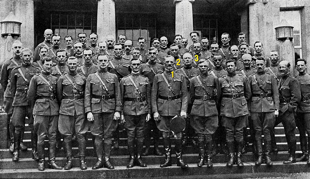 4th ID Commanders with GEN John J. Pershing (1). MAJ Karlstad (2) is over Pershing’s left shoulder and MAJ Edward M. “Ned” Almond (3) (CG, X Corps during Korean War) is to Karlstad’s left.